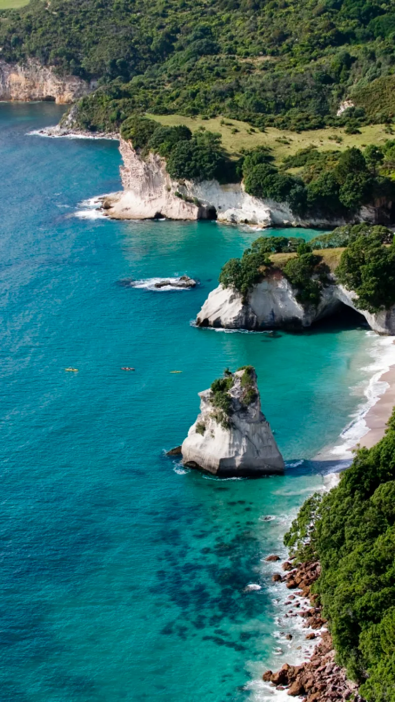 The Coromandel Peninsula is a special resort destination for New Zealanders. People come from Auckland, Hamilton, and other urban areas seeking the lifestyle of this beach town, relaxing on the beautiful white sandy beaches, fishing, surfing, and enjoying various marine sports. Along the beautiful coastline, the Pohutukawa trees bloom with their bright red flowers, showcasing a magnificent view on the west coast, while the east coast features a series of white sandy beaches, and inland, clear rivers flow through lush green forests.